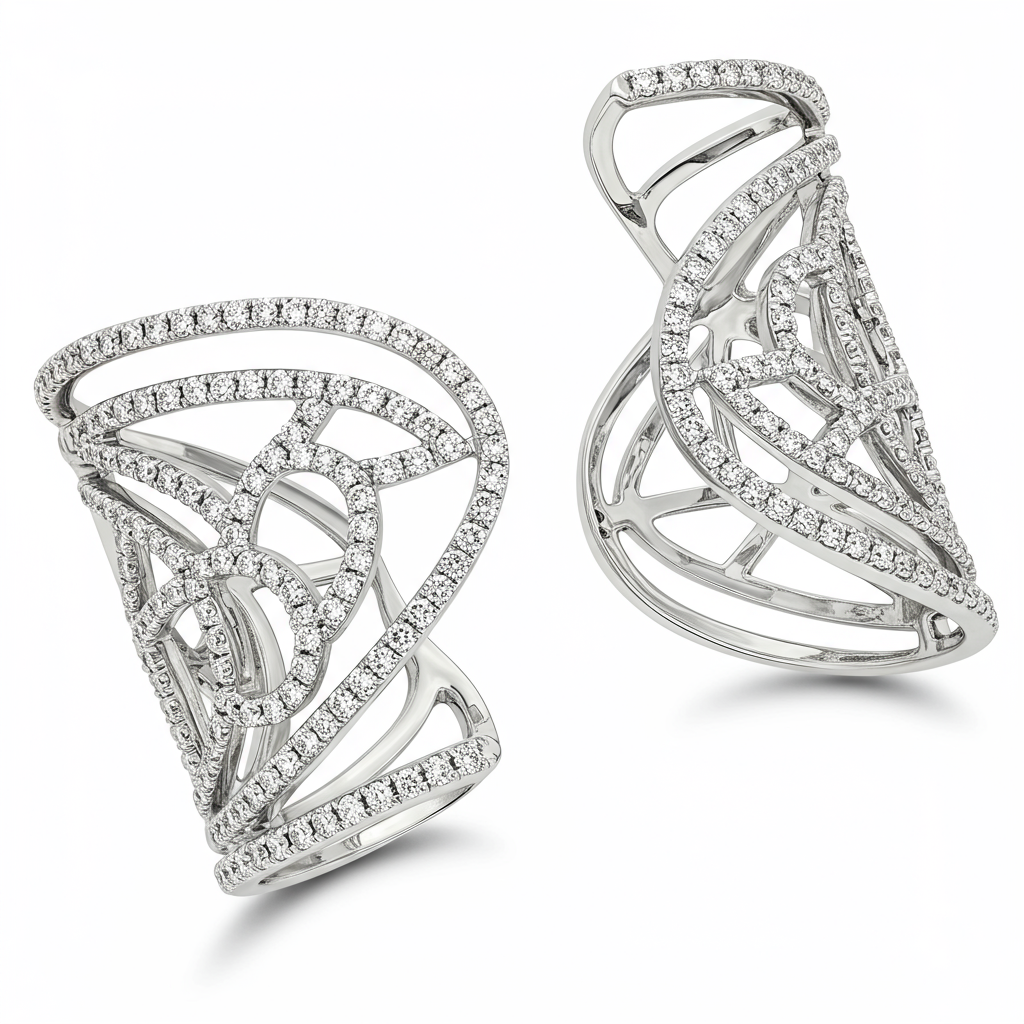 The Zox Diamond Cuff embodies architectural brilliance, featuring a sleek, asymmetric open design crafted in luminous 18KT white gold. This striking piece is meticulously set with micro-pave diamonds along its sculpted edges, capturing light from every angle. Its bold yet comfortable structure makes it an ideal statement piece, transitioning seamlessly from day wear to evening glamour. Defined by its flawless VVS clarity stones, this cuff offers unparalleled sophistication and modern luxury. It represents the pinnacle of contemporary jewelry craftsmanship.