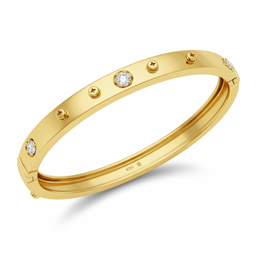 Experience the iconic design of this meticulously crafted love bracelet, symbolizing eternal commitment and devotion. Rendered in opulent 18KT yellow gold, this bangle features the signature screw motifs distributed around its robust circumference. It is elegantly secured by a functional locking mechanism, ensuring enduring wear. The bracelet’s highly polished surface provides a luxurious shine, making it a powerful statement piece for any collection. This timeless piece seamlessly blends architectural structure with profound sentiment.