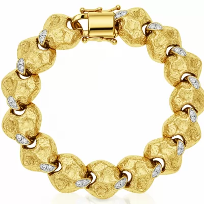 The Gold Nugget Bracelet is a powerful statement of rustic elegance and enduring luxury. Crafted meticulously in heavy 18KT yellow gold, this robust piece features bold, organically textured nugget links that catch the light dramatically. A careful arrangement of pave-set VVS diamonds enhances the unique contours, offering a brilliant contrast to the rugged gold finish. Secured with a heavy-duty box clasp, this heirloom-quality bracelet is designed for comfort and unwavering presence on the wrist.