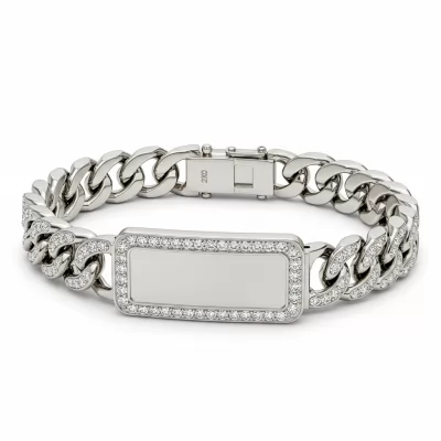 The Personalized ID Bracelet for men embodies contemporary masculinity and refined style. Crafted in substantial 18KT white gold, this piece features a heavy-duty curb chain connected to a sleek, polished plaque ideal for custom engraving. Subtle micro-pave diamonds adorn the edges of the ID segment, adding a discreet touch of brilliance without compromising its rugged aesthetic. This bracelet serves as a timeless keepsake, combining luxurious materials with deep personal significance.