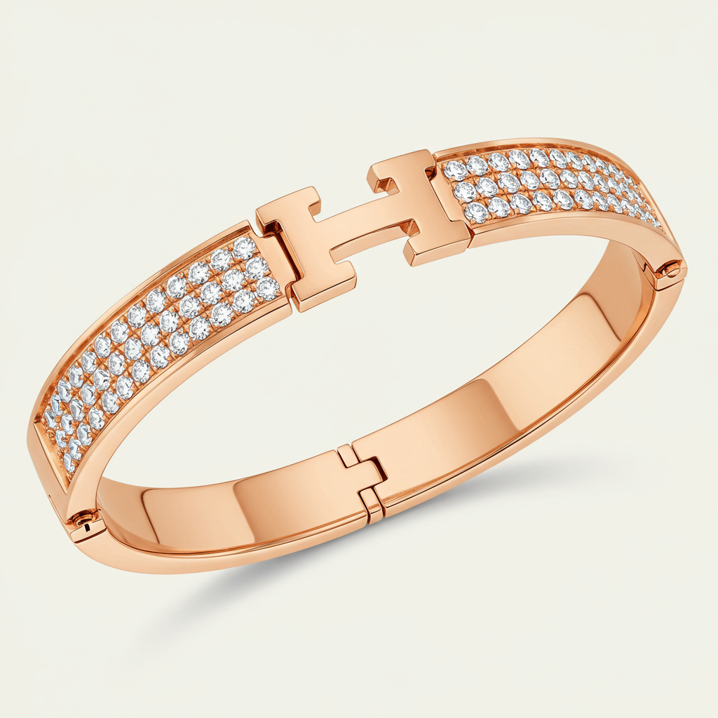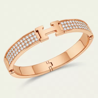 The iconic Hermès Clic H Bracelet is reimagined in luxurious 18KT rose gold, providing a warm and sophisticated aesthetic. This sophisticated hinged bangle features the signature 'H' clasp mechanism, symbolizing effortless chic and modern elegance. The wide band is meticulously set with micro-pave VVS diamonds, adding breathtaking brilliance to the classic design. Perfect for stacking or wearing as a standalone statement, this piece is the ultimate accessory for the discerning collector.