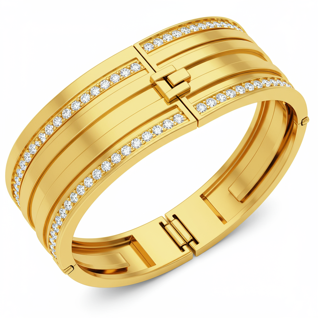 This exceptional men's bracelet redefines minimalist luxury through bold design and superior craftsmanship. Forged in substantial 18KT Yellow Gold, the polished surface features subtle, signature geometric engravings that ensure timeless appeal. A secure hidden clasp ensures seamless wearability, making it the perfect statement piece for the discerning modern gentleman. The design is subtly accented with strategically placed VVS diamonds, adding a flash of sophisticated brilliance to the robust form.