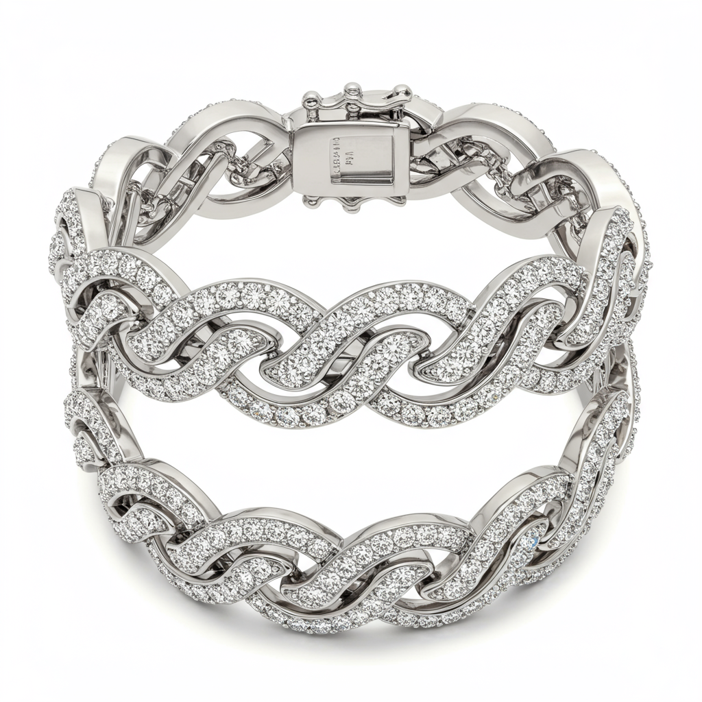 The Holy Water Bracelet captures liquid grace and timeless devotion through its sophisticated articulation. Crafted in luminous 18KT white gold, this piece features perfectly interlocking segments, symbolizing continuous movement and flow. Each link is meticulously set with brilliant VVS G-H diamonds, creating an unending cascade of light and unparalleled sparkle. This exquisite bracelet offers a profound blend of symbolism and modern luxury, ensuring it remains a powerful statement accessory for generations.