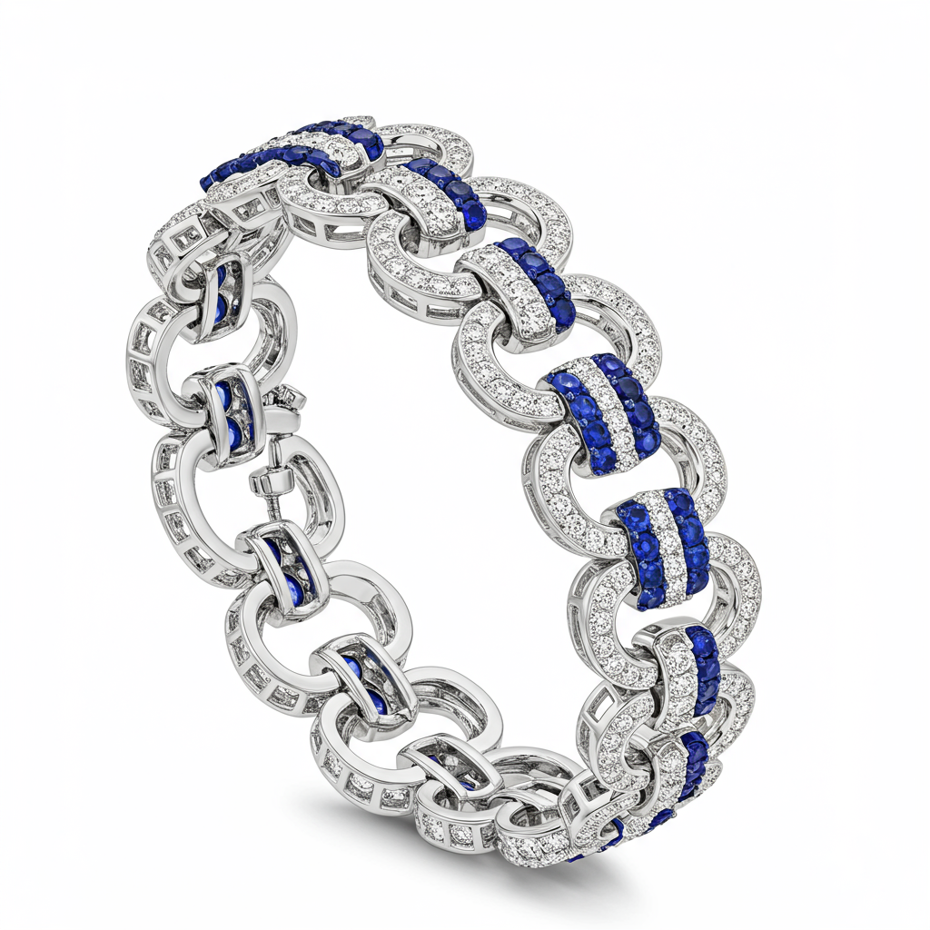 The Blue Movement Bracelet is an engineering marvel, featuring highly articulating links crafted from polished 18KT white gold. This flexible cuff design is meticulously paved throughout with brilliant VVS diamonds, creating a stunning cascade of light across the wrist. Central to the aesthetic are strategically placed natural blue sapphires, which provide a striking contrast and profound depth. The bracelet’s ergonomic flexibility ensures supreme comfort and smooth movement, making it a luxurious statement piece perfect for grand occasions and sophisticated wear.