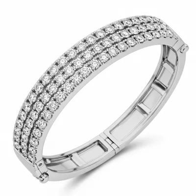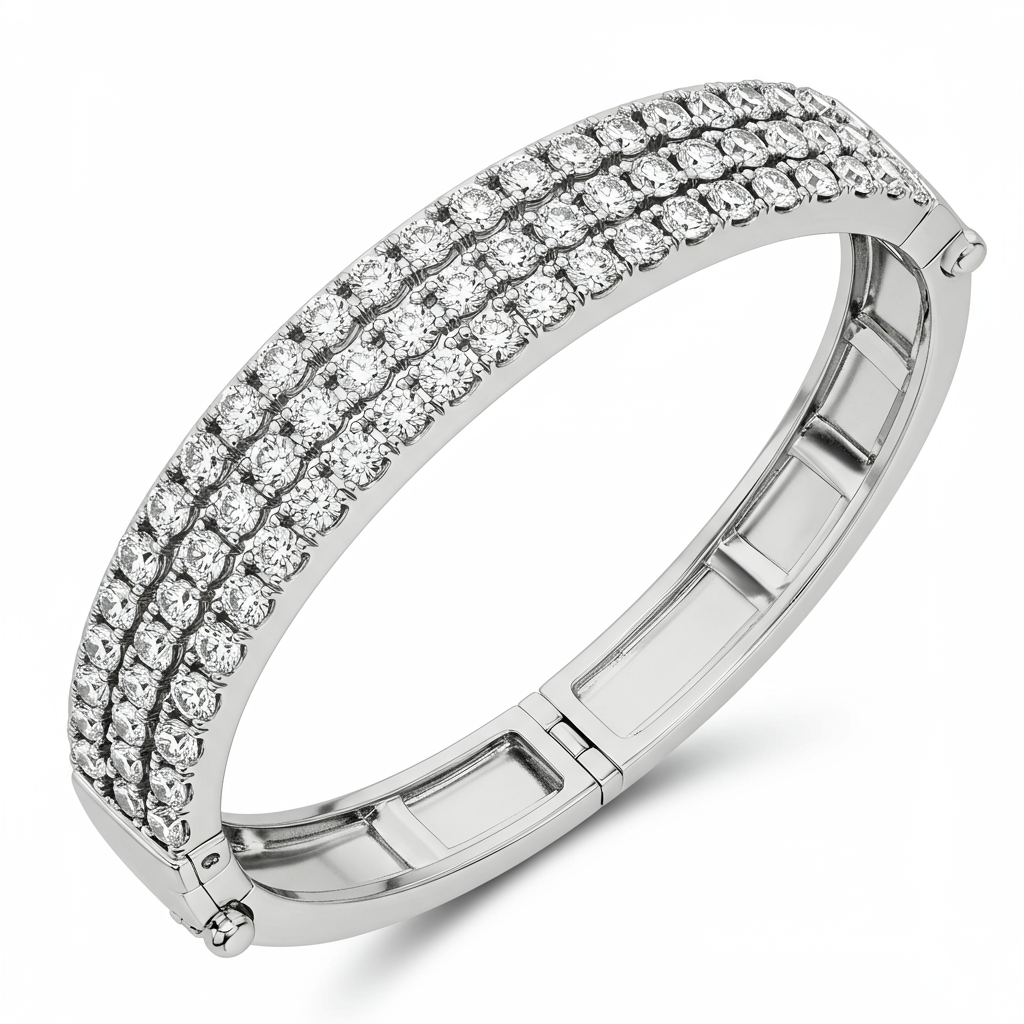 This exquisite 18KT white gold bangle bracelet defines effortless sophistication through its sleek, modern architecture. Featuring a continuous line of brilliant-cut VVS diamonds meticulously set in a secure channel, this piece radiates unparalleled light and fire. Its ergonomic design ensures comfortable daily wear while serving as a statement of refined taste. An essential addition to any luxury collection, this bracelet transitions seamlessly from day attire to evening gala.