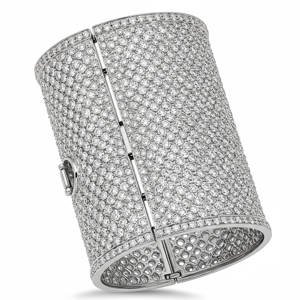 The 'Bracelet Book' cuff is an exquisite masterpiece crafted in polished 18KT white gold, featuring a sophisticated hinge mechanism that mimics the binding of an ancient tome. Its surface is meticulously paved with brilliant VVS diamonds, creating an uninterrupted flow of light and luxury across the entire structure. This unique piece combines intellectual elegance with unparalleled craftsmanship, designed for the wearer who appreciates artistry in fine jewelry. It secures comfortably and makes a profound, luxurious statement on the wrist.