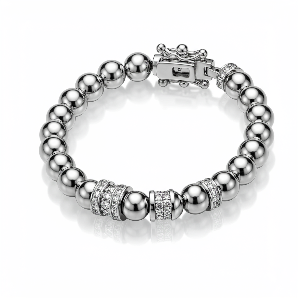 The Bead Bracelet embodies effortless elegance through its continuous stream of perfectly polished metal beads. Crafted in luminous 18KT white gold, this piece offers a refined yet versatile aesthetic, ideal for daily wear or luxurious layering. Interspersed throughout the design are delicate settings holding micro-pave VVS diamonds, adding a subtle, brilliant shimmer that catches the light beautifully. This adjustable bracelet is secured by a sturdy, high-polish clasp, ensuring comfort and security while maintaining a fluid drape on the wrist.