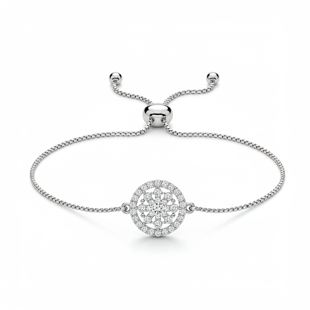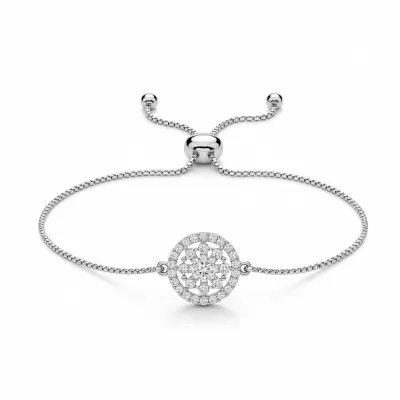 The 'how to tie a bracelet' design marries functional elegance with high luxury, featuring an innovative adjustable chain mechanism for the perfect, custom fit. Crafted in luminous 18KT white gold, this delicate piece is accented by a shimmering cluster of VVS round diamonds, capturing light with every movement. This bracelet is designed for effortless daily wear, providing both security and sophisticated sparkle, making it a timeless addition to any collection. The superior craftsmanship ensures both durability and luxurious appeal.