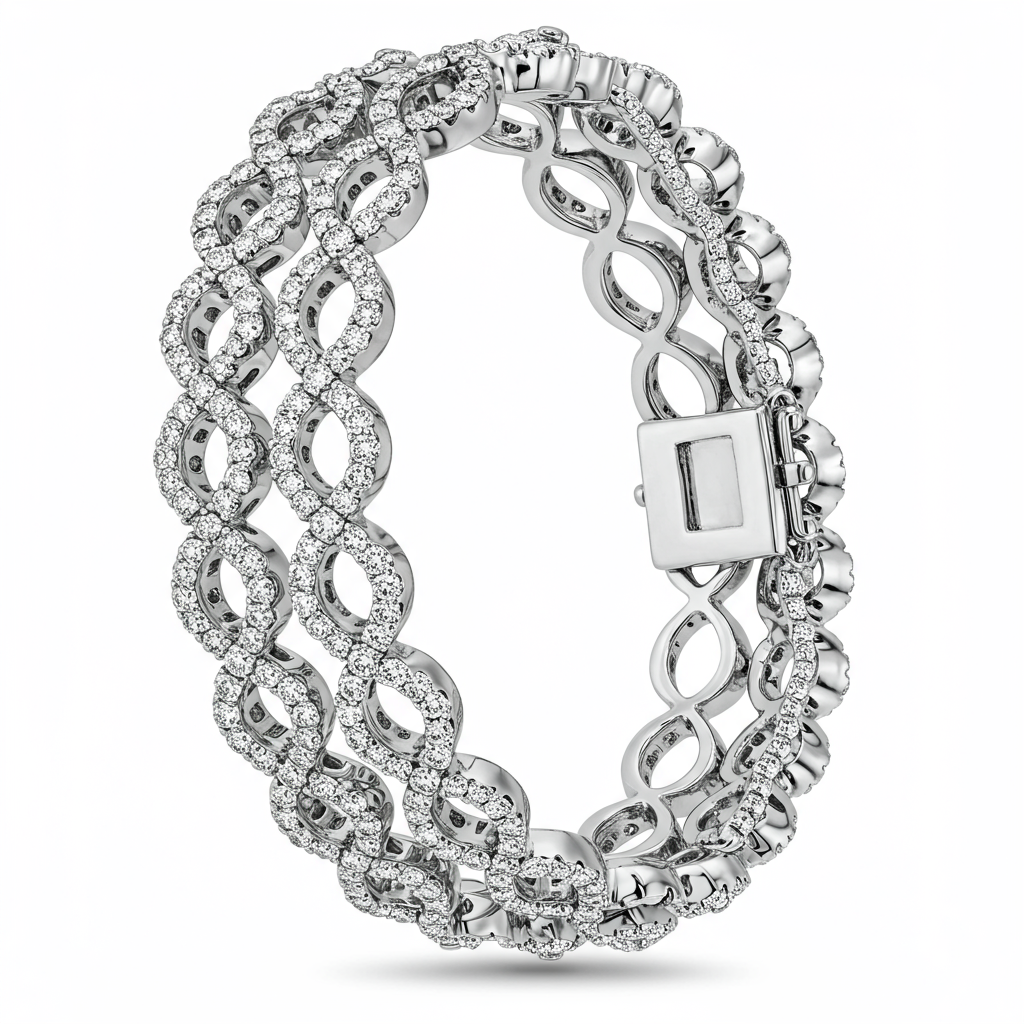 The Bracelet Stack is the epitome of modern elegance, designed to deliver maximum brilliance in a sophisticated layered look. Featuring three interconnected strands, the design is meticulous, showcasing perfectly matched VVS diamonds in a flawless 18KT white gold setting. This dynamic ensemble ensures a continuous flow of light, creating an unparalleled sparkle on the wrist. It offers the curated collection aesthetic combined with the convenience of a single magnificent piece, perfect for luxurious formal wear or elevated everyday styling.