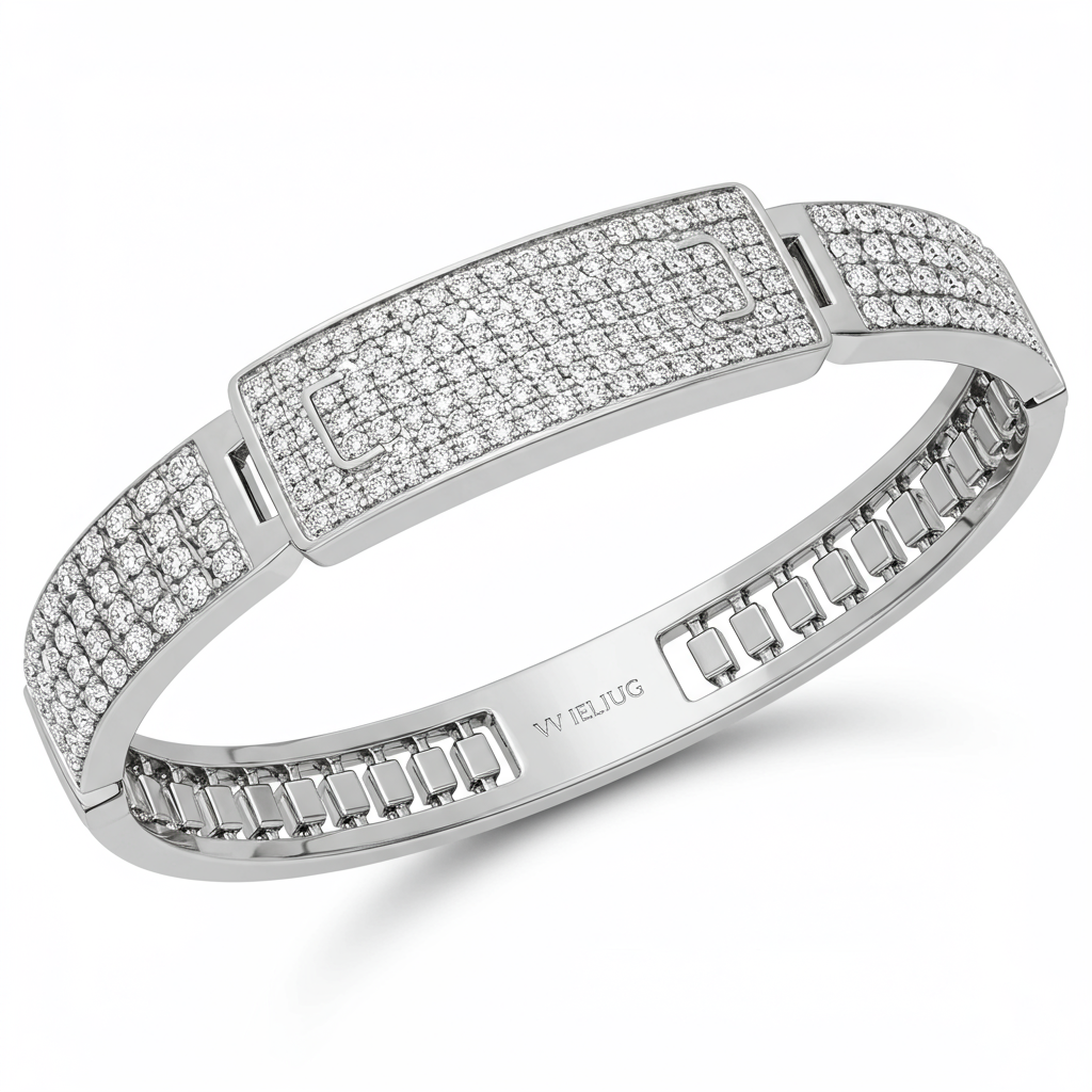 The ultimate expression of personalized luxury, this ID bracelet blends modern sophistication with timeless elegance. Crafted in polished 18KT white gold, the central plaque is meticulously paved with brilliant VVS diamonds, creating a continuous field of light. A robust yet refined chain ensures a comfortable fit and enduring style. This piece serves as a statement of identity and exquisite taste, perfect for daily wear or special occasions.
