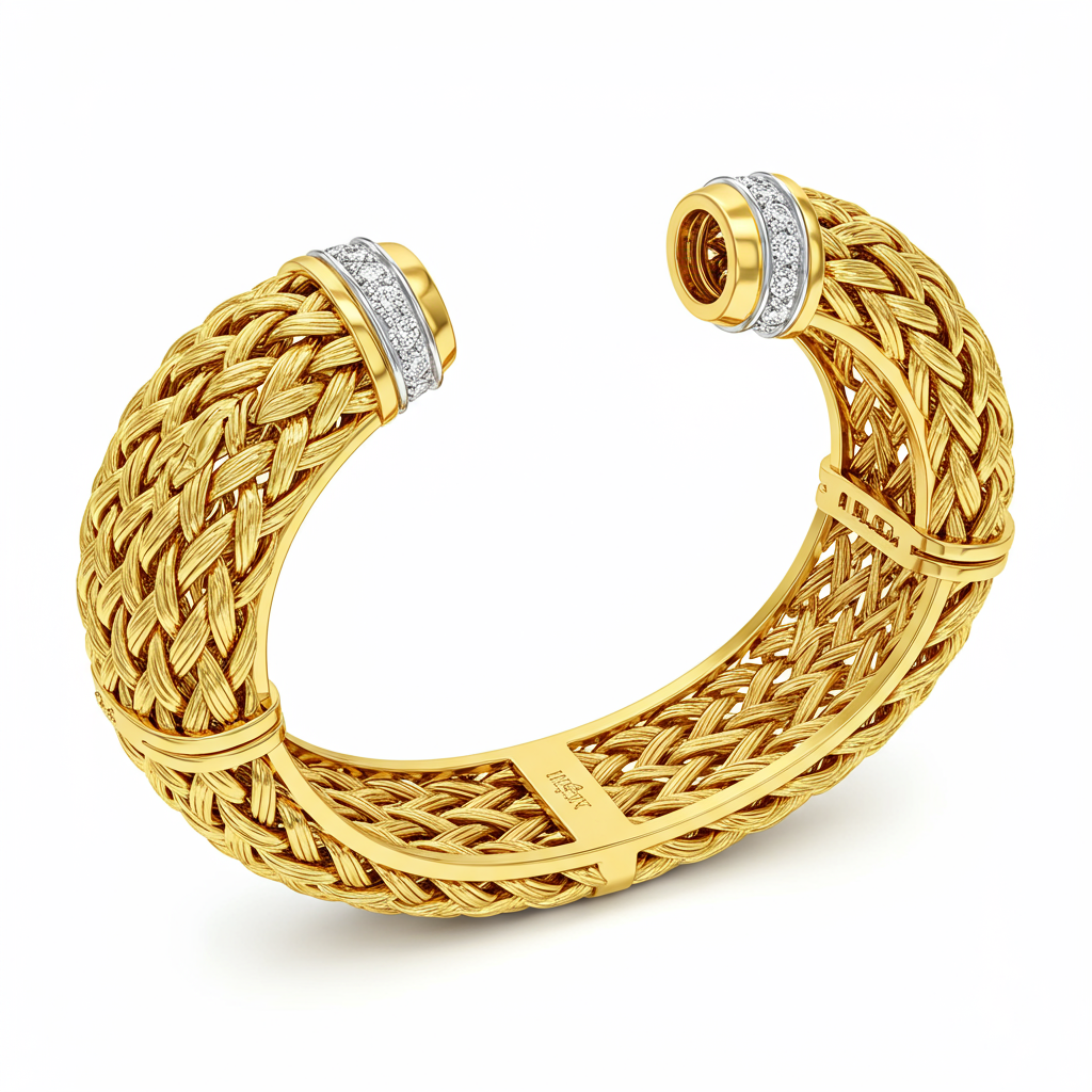 This exclusive John Hardy-inspired bracelet masterfully combines traditional craftsmanship with modern luxury design. Crafted in rich 18KT yellow gold, the structured cuff features the iconic woven texture, symbolizing community and eternal flow. A seamless line of micropave VVS diamonds enhances the central ridge, offering brilliant sparkle. This statement piece is a testament to meticulous artistry and timeless elegance, perfect for the discerning collector.