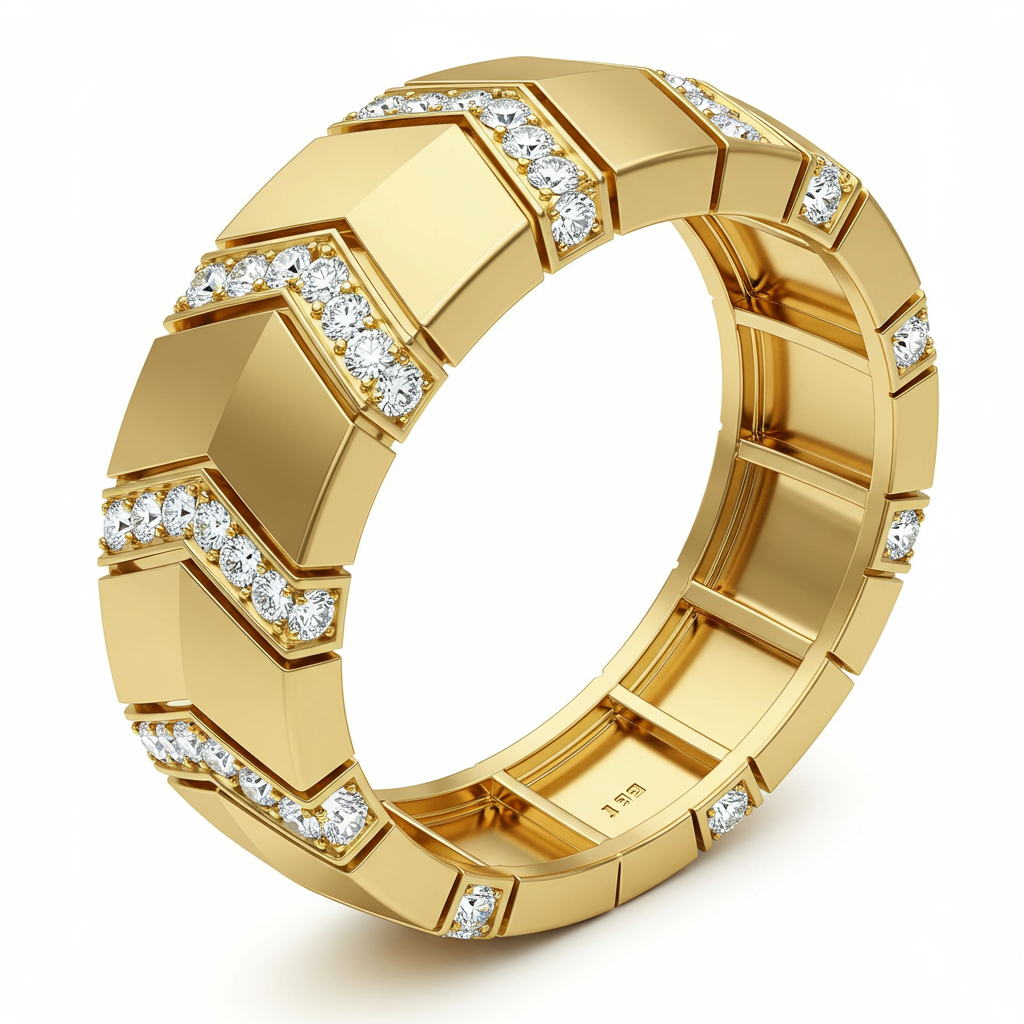 This iconic cuff bracelet draws inspiration from classic Italian high-fashion architecture, delivering a statement of unparalleled luxury and boldness. Crafted meticulously in radiant 18KT yellow gold, its substantial form provides a comfortable yet commanding presence on the wrist. The geometric lines are flawlessly adorned with pave-set brilliant diamonds, enhancing the piece's sculptural elegance and generating mesmerizing sparkle. This bracelet is designed for the discerning individual seeking timeless glamour and modern sophistication.