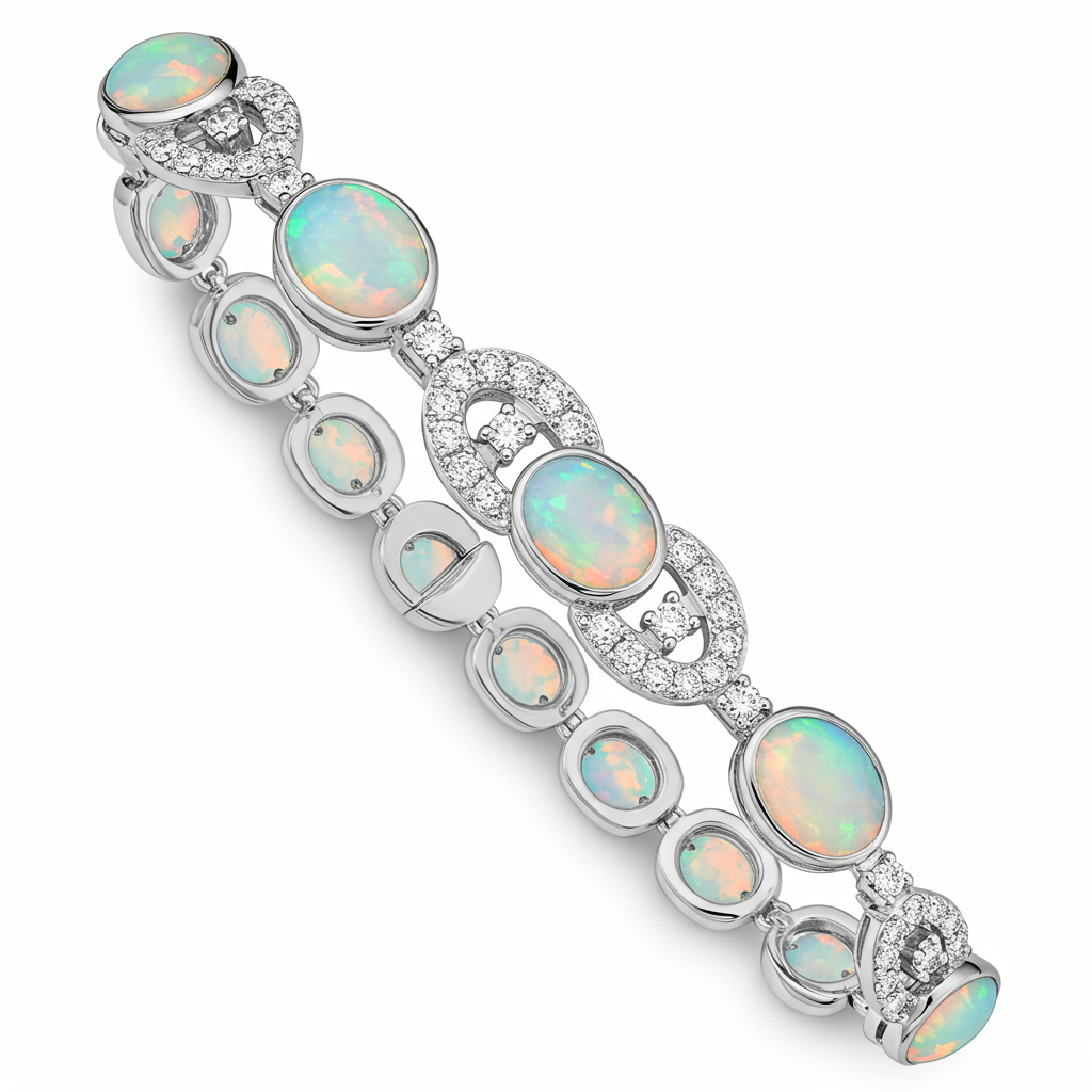 This magnificent link bracelet showcases the ethereal beauty of natural Australian Opals, set in flawless 18KT white gold. Seven vibrant oval opal cabochons are meticulously bezel-set, each flashing with intense, unique colors. The intermediate links are richly paved with 1.25 carats of brilliant VVS round diamonds, providing breathtaking sparkle and contrast. A true statement piece, this Opal and Diamond Bracelet is designed to become a cherished heirloom, embodying elegance and mesmerizing light play.