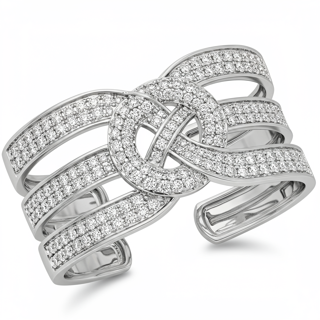 The Knot Bracelet embodies timeless elegance through its intricate, symbolic design. Crafted in luminous 18KT white gold, this piece features a central, interwoven knot motif fully paved with brilliant diamonds. This sophisticated cuff wraps the wrist effortlessly, symbolizing unbreakable connection and strength. It is a striking statement piece perfect for special occasions or elevating everyday luxury.