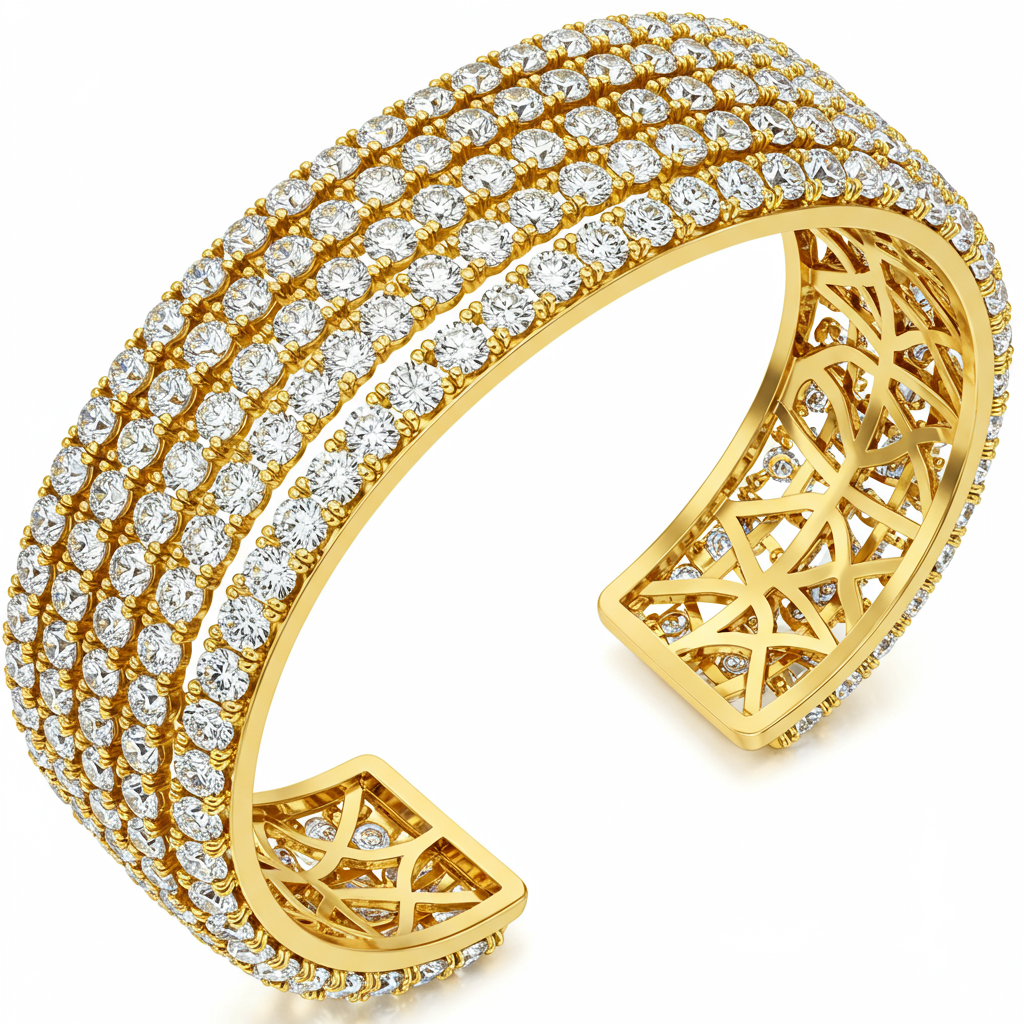 The JewelGravity Louis Vuitton inspired bracelet embodies timeless luxury and contemporary design. Crafted from rich 18KT yellow gold, this iconic bangle features clean lines and a sophisticated, feminine silhouette. It is meticulously adorned with micro-pave-set VVS diamonds, delivering exceptional brilliance and sparkle from every angle. This versatile piece seamlessly transitions from everyday elegance to sophisticated evening wear, making it a definitive statement accessory for the modern woman.
