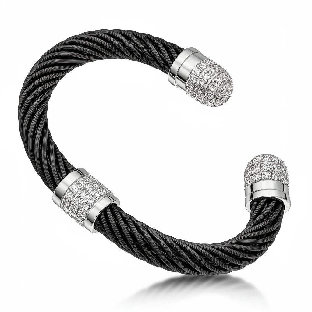 A robust and luxurious men's cuff bracelet, embodying the iconic sculpted cable design. Crafted with substantial 18KT white gold endcaps, this piece offers a sophisticated blend of rugged texture and refined brilliance. The distinctive cuff ends are meticulously micro-paved with brilliant-cut VVS diamonds, delivering subtle yet undeniable luxury and powerful contrast. This design provides a secure and comfortable fit, making it the definitive statement accessory for the modern gentleman.
