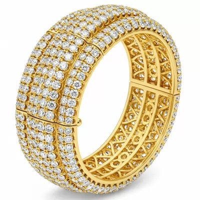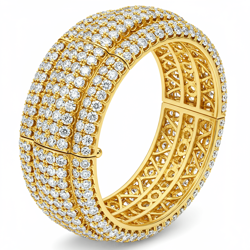 This exquisite hinged cuff bracelet captures timeless elegance, reinterpreting classic design codes into a wearable statement piece. Crafted in radiant 18KT yellow gold, its sleek silhouette is meticulously detailed with precision-set VVS diamonds. The robust construction and integrated closure ensure a secure and comfortable fit, making it perfect for daily wear or elevated evening attire. This iconic design seamlessly blends modern structure with unparalleled diamond brilliance, offering true luxury. It is a stunning addition to any high-fashion collection.