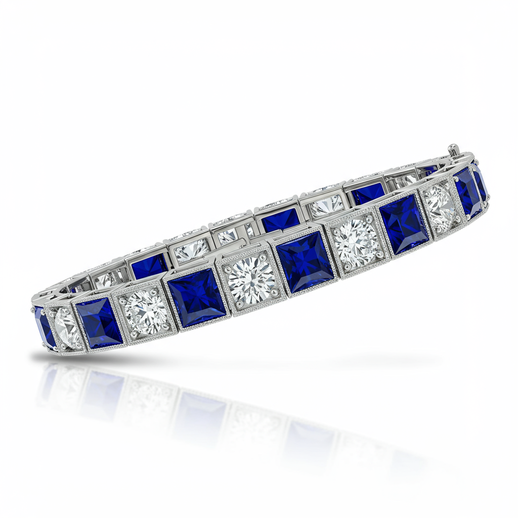 This exceptional blue bracelet marries contemporary design with timeless elegance, featuring an alternating sequence of brilliant diamonds and deep blue sapphires. Crafted in luminous 18KT white gold, the articulation allows the bracelet to drape beautifully on the wrist, catching light from every angle. The precision setting of VVS clarity diamonds ensures maximum sparkle, while the rich hue of the sapphires provides a striking contrast. This piece serves as a magnificent statement accessory, perfect for elevating evening wear or commemorating a significant milestone.
