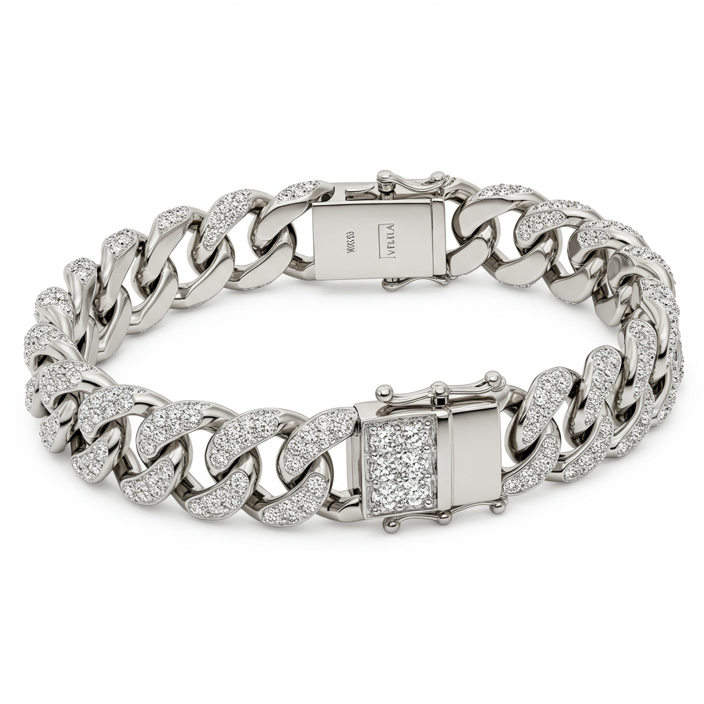 This distinguished men's bracelet masterfully blends robust design with subtle luxury. Crafted in polished 18KT white gold, the sturdy curb link structure provides a masculine profile. Select links are meticulously set with high-brilliance VVS diamonds, adding an unexpected flash of sophistication. This exceptional piece is secured by an integrated clasp, making it a timeless accessory for the modern gentleman who appreciates understated elegance.
