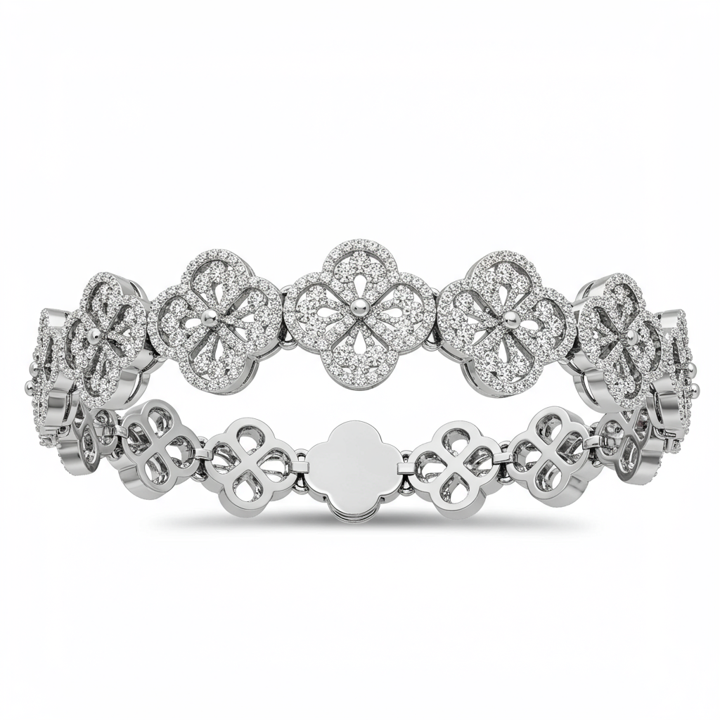 The Four Leaf Clover Bracelet embodies eternal luck and exquisite craftsmanship. Crafted in luminous 18KT white gold, this station bracelet features five delicate clover motifs, each meticulously micro-paved with brilliant round diamonds. The high-polish links provide comfortable movement, ensuring it rests perfectly on the wrist. This piece is a sophisticated talisman, blending symbolic elegance with breathtaking sparkle, perfect for daily wear or special occasions.