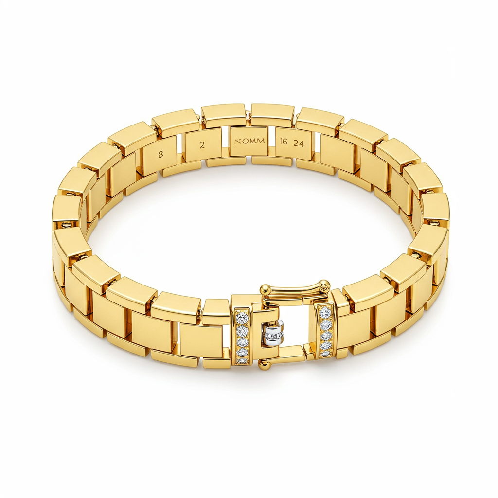 The Nomination Bracelet is a testament to personalized elegance, crafted meticulously in rich 18KT yellow gold. Featuring a sophisticated modular link system, this piece allows for endless customization and story-telling through collectible charms. Each link boasts subtle engraving and a perfect mirror finish, creating a refined backdrop for future additions. This bracelet transitions seamlessly from casual daytime wear to elegant evening attire, symbolizing milestones and memories. It is secured by a robust, hidden clasp mechanism ensuring both security and comfort.