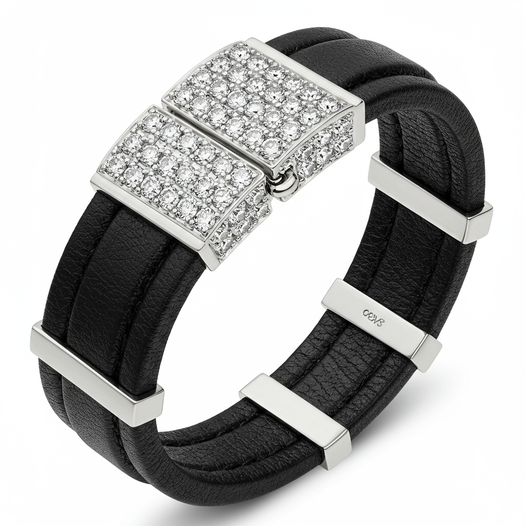 This rugged yet elegant cuff bracelet seamlessly merges luxurious materials. Crafted from rich, supple black leather, it features a striking centerpiece cast in 18KT white gold. The secure box clasp is brilliantly detailed with a row of meticulously set VVS round diamonds, offering a captivating contrast to the leather's texture. This piece is perfect for the modern individual who values sophisticated design with an edge.
