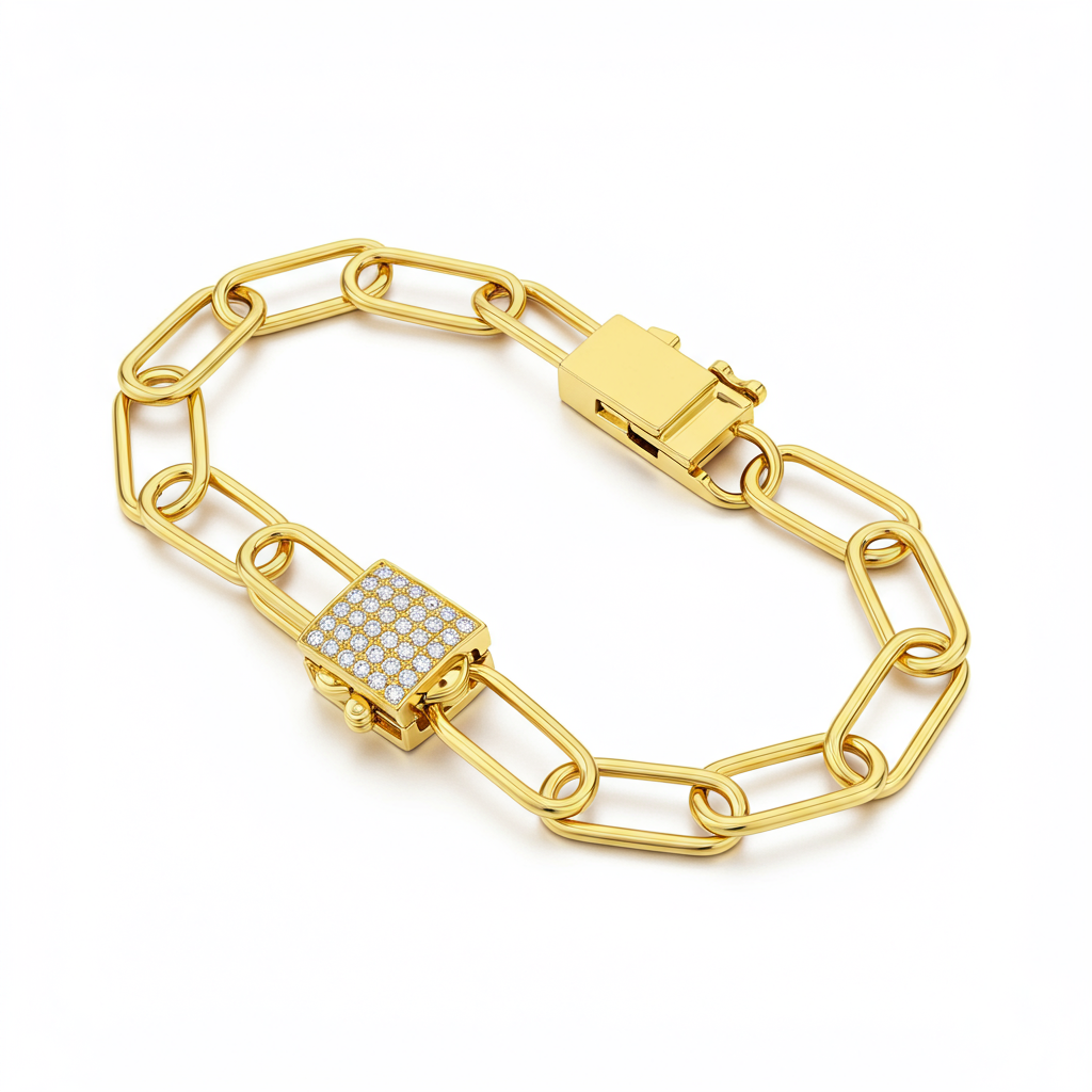 The 18KT Yellow Gold Paper Clip Bracelet reinvents everyday style with luxurious, elongated links that offer a bold yet refined statement. Each link is meticulously polished, and the secure clasp is accented with brilliant VVS diamonds for subtle luxury. This modern classic design captures contemporary elegance, ensuring a comfortable fit and enduring shine. It is the perfect piece for sophisticated layering or stunning solo wear.
