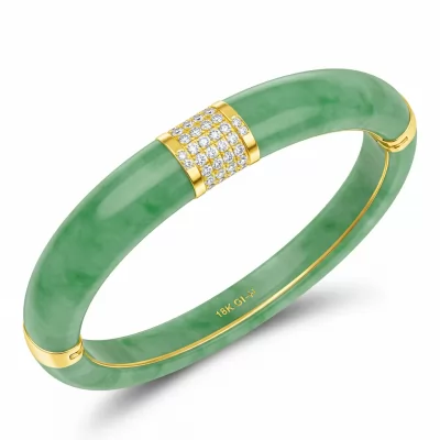 This exquisite real jade bracelet embodies tranquility and timeless elegance. Hand-carved from a single piece of premium natural jadeite, its smooth, polished surface feels cool and comforting against the skin. The vibrant green hue is accented by a delicate 18KT yellow gold hinged clasp, subtly enhanced with pave-set VVS diamonds for a touch of modern luxury. This heirloom piece symbolizes prosperity and sophistication, perfect for the discerning collector.