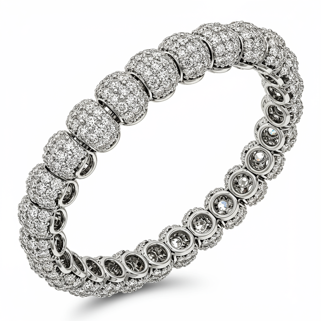 This exquisite beaded bracelet redefines classic luxury with its meticulous craftsmanship. Each 18KT white gold bead is expertly set with brilliant VVS diamonds, creating a continuous stream of scintillating light. The fluid design drapes elegantly on the wrist, offering a flexible and comfortable fit suitable for daily wear or evening events. It features a secure clasp mechanism, ensuring both safety and sophistication.