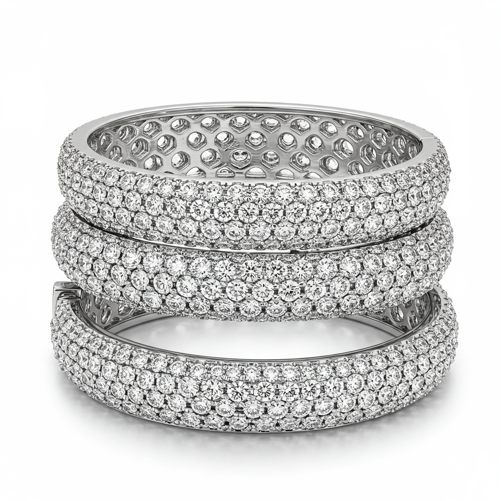 The 'bracelet stacks' collection features a trio of meticulously crafted 18KT white gold bangles designed for luxurious layering. Each bracelet is adorned with brilliant pave-set VVS diamonds, catching the light with unparalleled radiance. This versatile set can be worn individually for subtle elegance or stacked together to create a powerful, contemporary statement. Elevate your jewelry wardrobe with this essential combination of modern design and timeless glamour.