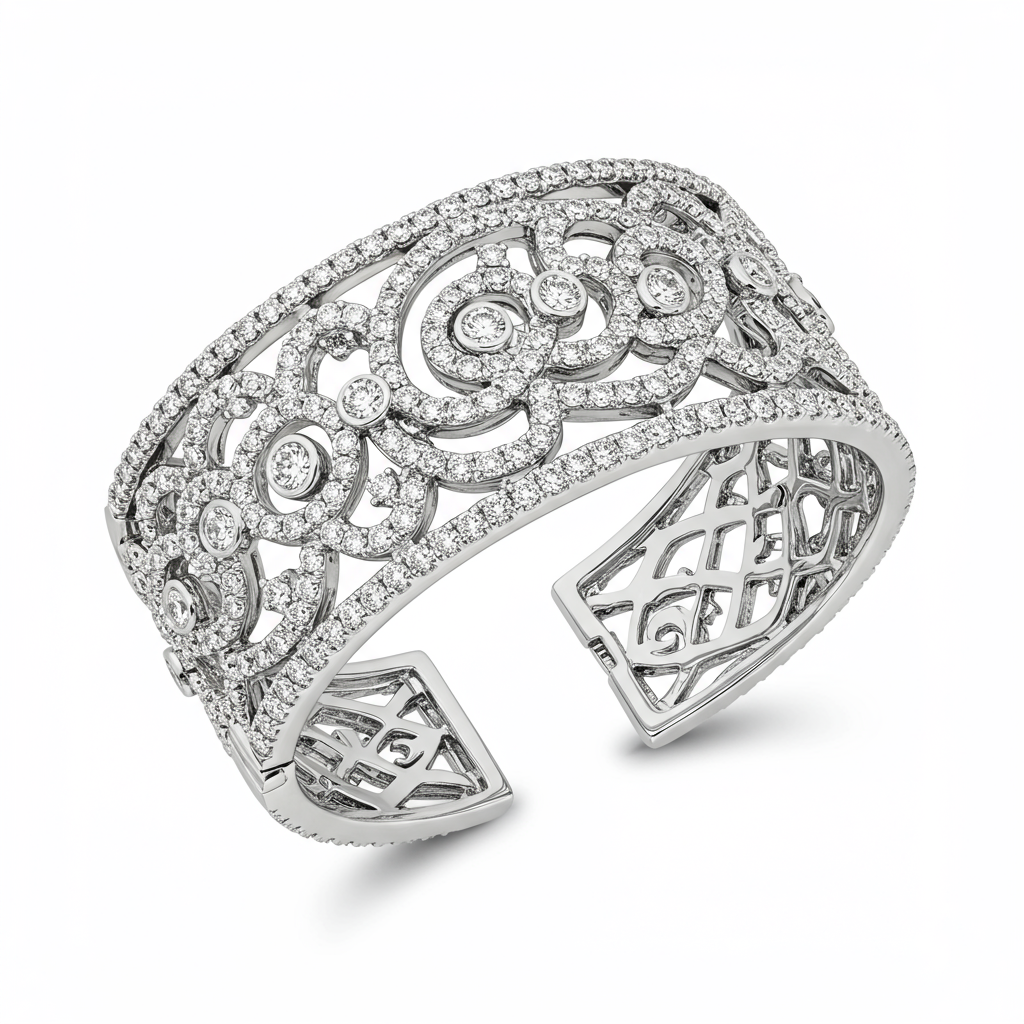 The Ringing Bracelet is an exquisite statement piece defined by its architectural elegance and brilliant pavé work. Crafted in luminous 18KT white gold, this cuff-style design features a dynamic, segmented structure that catches the light from every angle. It is fully adorned with numerous VVS diamonds, creating an uninterrupted surface of superior sparkle and movement. This bracelet is designed to offer both structural comfort and breathtaking visual impact, perfect for black-tie events or elevated daily wear.