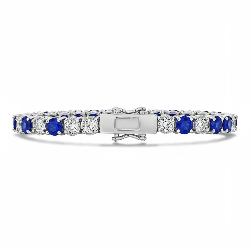This exquisite sapphire tennis bracelet is crafted in luminous 18KT white gold. It features a continuous stream of vibrant blue sapphires, meticulously interspersed with brilliant, conflict-free VVS diamonds. The secure clasp ensures comfort and safety while showcasing timeless luxury on the wrist. This piece is the definitive statement of elegance and sophistication, ideal for formal occasions and heirloom collection. The alternating pattern creates striking visual rhythm and depth.