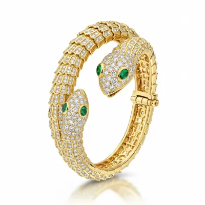 Embrace opulent elegance with this magnificent serpent cuff, masterfully crafted in rich 18KT yellow gold. The entire body is blanketed in meticulously set VVS brilliant round diamonds, capturing light from every angle to create a continuous, scintillating movement. This symbolic piece culminates in striking emerald eyes, lending an intense, mesmerizing gaze. It is a true statement of transformation and eternal luxury, designed for the most sophisticated collector.