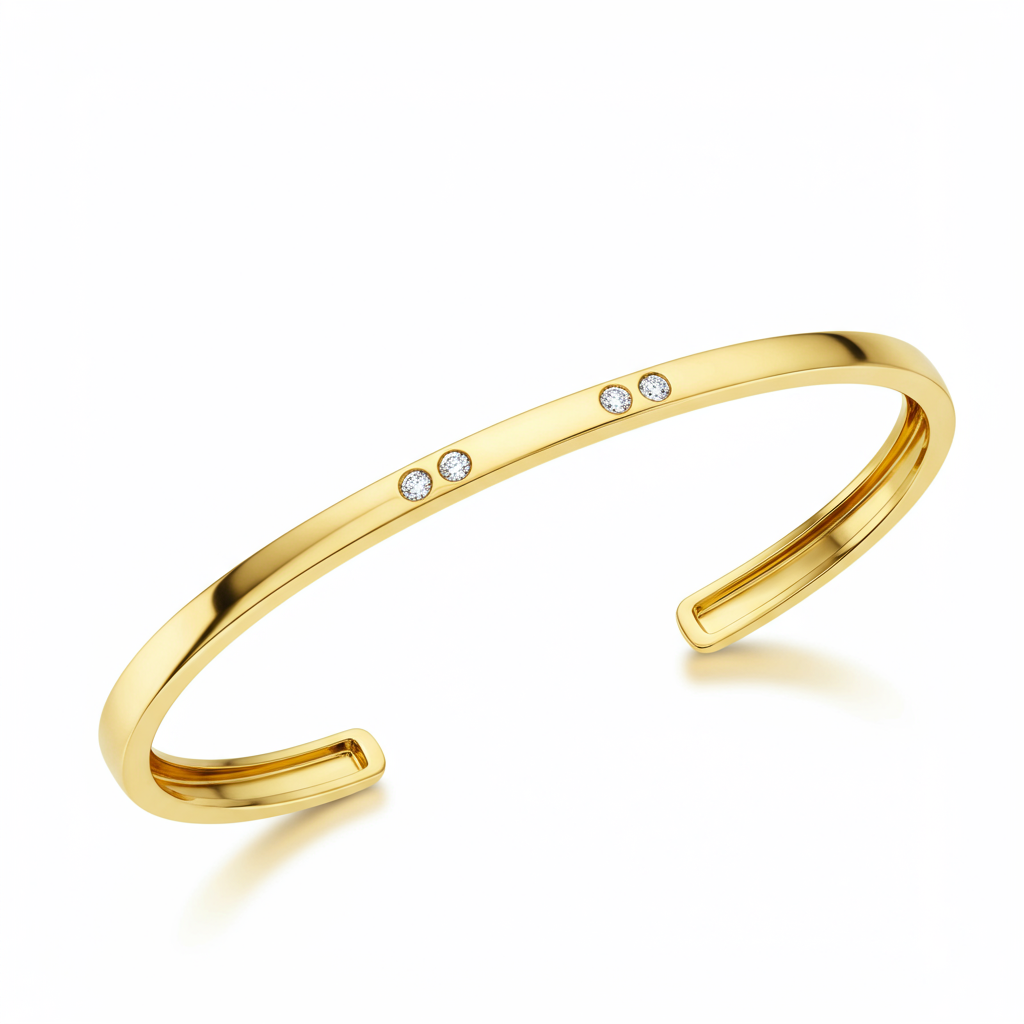This exquisitely crafted solid gold bracelet embodies minimalist luxury and timeless sophistication. Forged in 18KT yellow gold, the sleek cuff design offers a substantial yet comfortable weight on the wrist. A high-polish finish accentuates the rich luster of the precious metal, making it a statement piece for daily wear or formal occasions. Three subtle, brilliant-cut accent diamonds provide a hint of scintillating sparkle. This bracelet is designed for enduring elegance and heirloom quality.