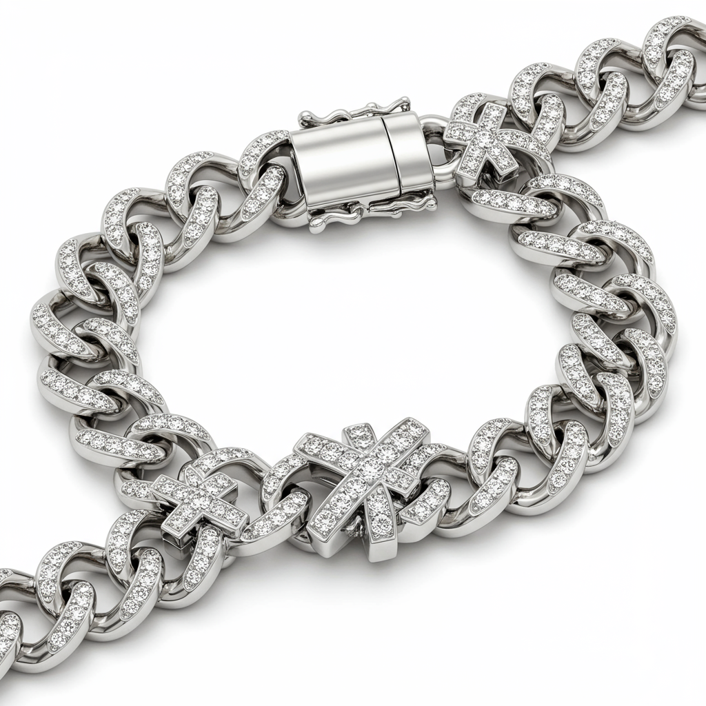 The Chrome Heart Bracelet is an ultimate statement piece, embodying rugged luxury and rebellious elegance. Crafted in heavy 18KT white gold, this iconic link design features meticulously set micro-pave diamonds across every signature cross motif. Its robust construction ensures lasting durability, while the brilliant VVS diamond accents provide a captivating sparkle. This masterpiece is designed for those who appreciate contemporary gothic high jewelry.