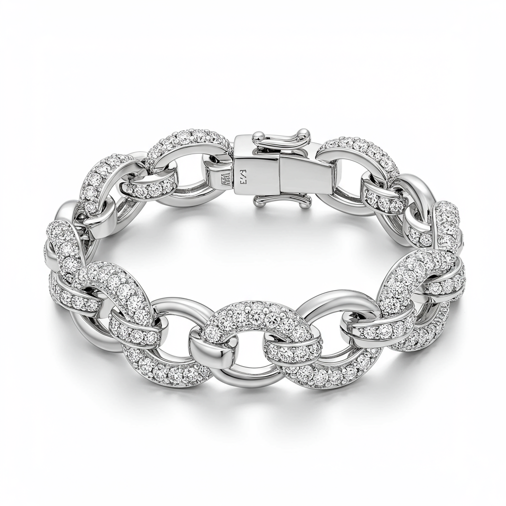 The Jubilee Bracelet is an architectural masterpiece, defined by its intricate alternating link design and unparalleled brilliance. Crafted in lustrous 18KT white gold, this cuff features precision-set VVS round diamonds that capture light from every angle. It represents a timeless blend of modern structure and classic elegance, secured with a seamless safety clasp. This bracelet serves as the quintessential statement piece, perfect for marking life's most significant milestones.
