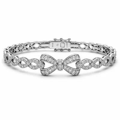 The Pandora Bow Bracelet is an exquisite celebration of feminine elegance and high-end craftsmanship. Crafted in luminous 18KT white gold, this piece features a series of delicate links culminating in a stunning centerpiece shaped like a flowing bow. The entire bow is meticulously paved with brilliant VVS round diamonds, capturing light from every angle. This luxurious bracelet secures comfortably with an expertly engineered clasp, making it a perfect statement accessory for any grand occasion.