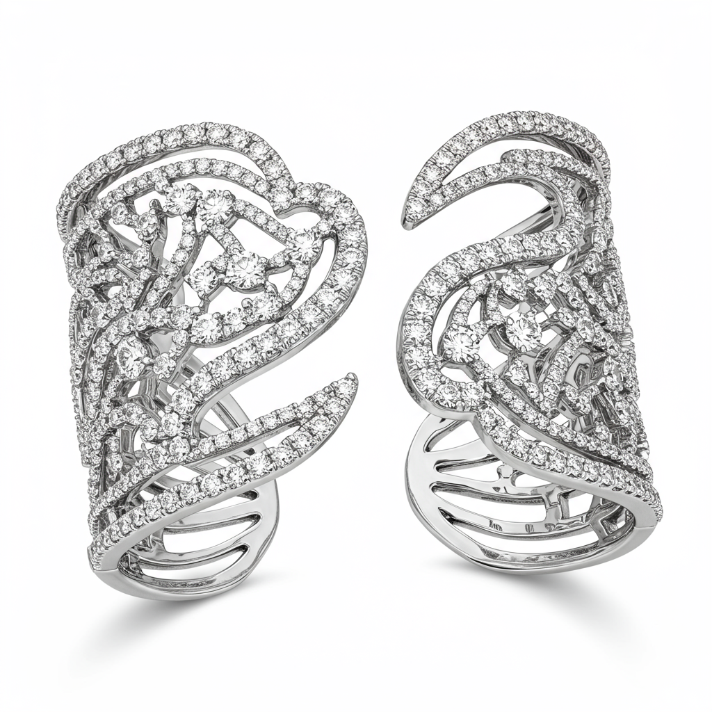 The cuff bracelet is a masterful expression of contemporary elegance and structure. Crafted in lustrous 18KT white gold, its open silhouette wraps the wrist with sophisticated grace. This statement piece is meticulously set with brilliant VVS diamonds across its contours, maximizing sparkle from every angle. It offers a perfect balance of architectural precision and radiant luxury, suitable for the most discerning collector.