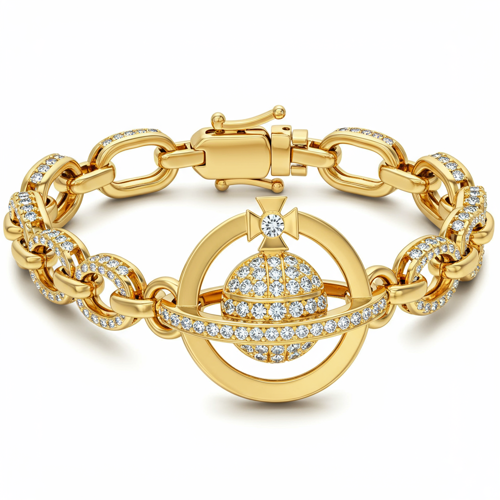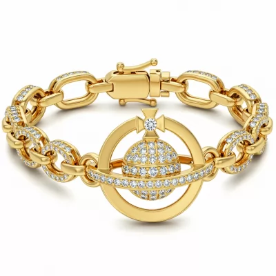 The Vivienne Westwood inspired bracelet captures iconic rebellious elegance and refined sophistication. Crafted in lustrous 18KT yellow gold, this fine jewelry piece features the signature Orb motif adorned with brilliant-cut micro-pave diamonds. It offers a perfect balance of heritage punk aesthetics and luxurious craftsmanship. This statement accessory secures gracefully around the wrist with a sturdy clasp, ensuring timeless appeal and striking wearability.