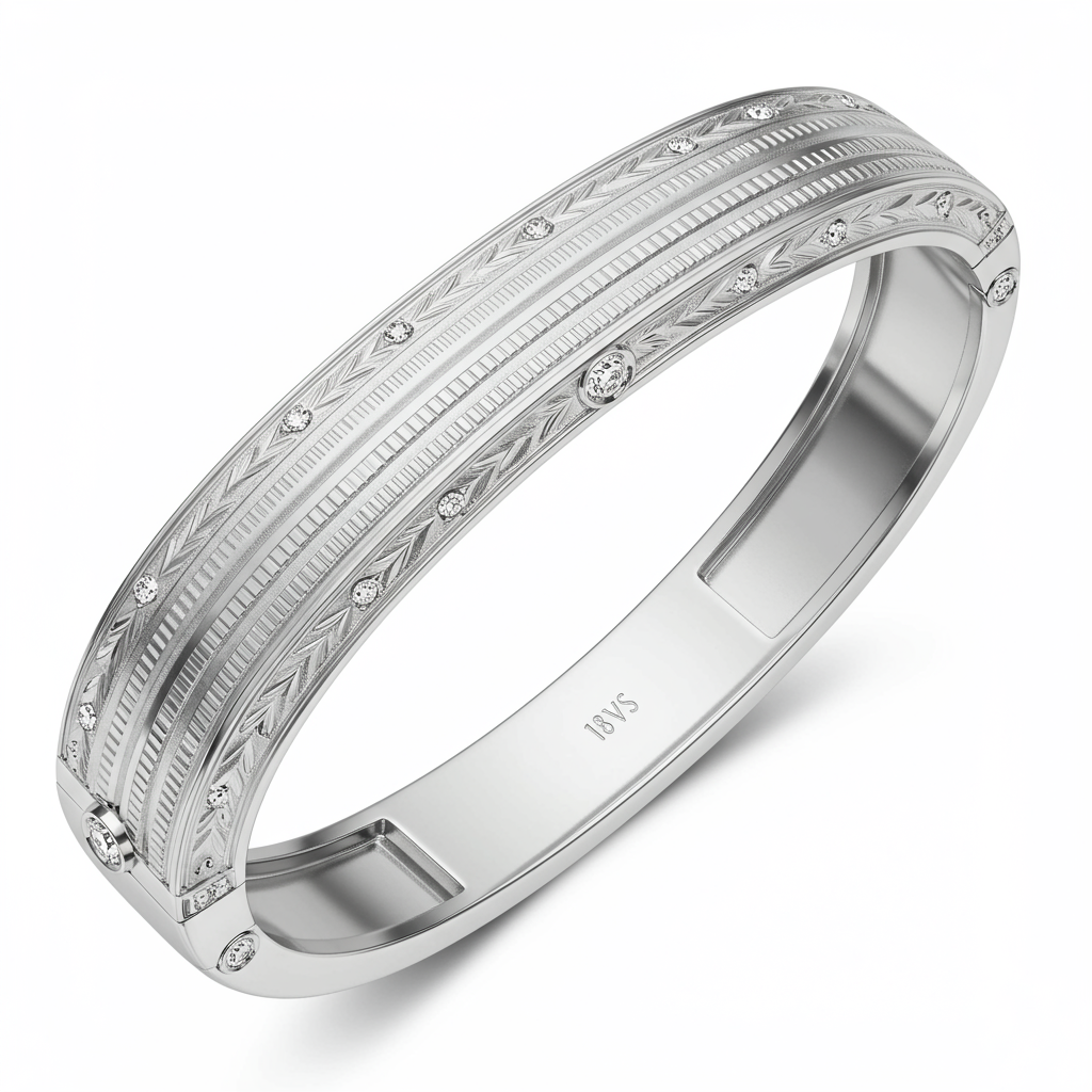The engraved bracelets cuff captures timeless artistry through exceptional modern design. Crafted in radiant 18KT gold, its wide surface showcases deep, precise linear engraving, creating a compelling texture and visual flow. Subtle accents of high-quality VVS diamonds are strategically placed to highlight the design's elegant curvature. This bracelet serves as a luxurious statement piece, perfect for those who appreciate both traditional craftsmanship and contemporary flair.