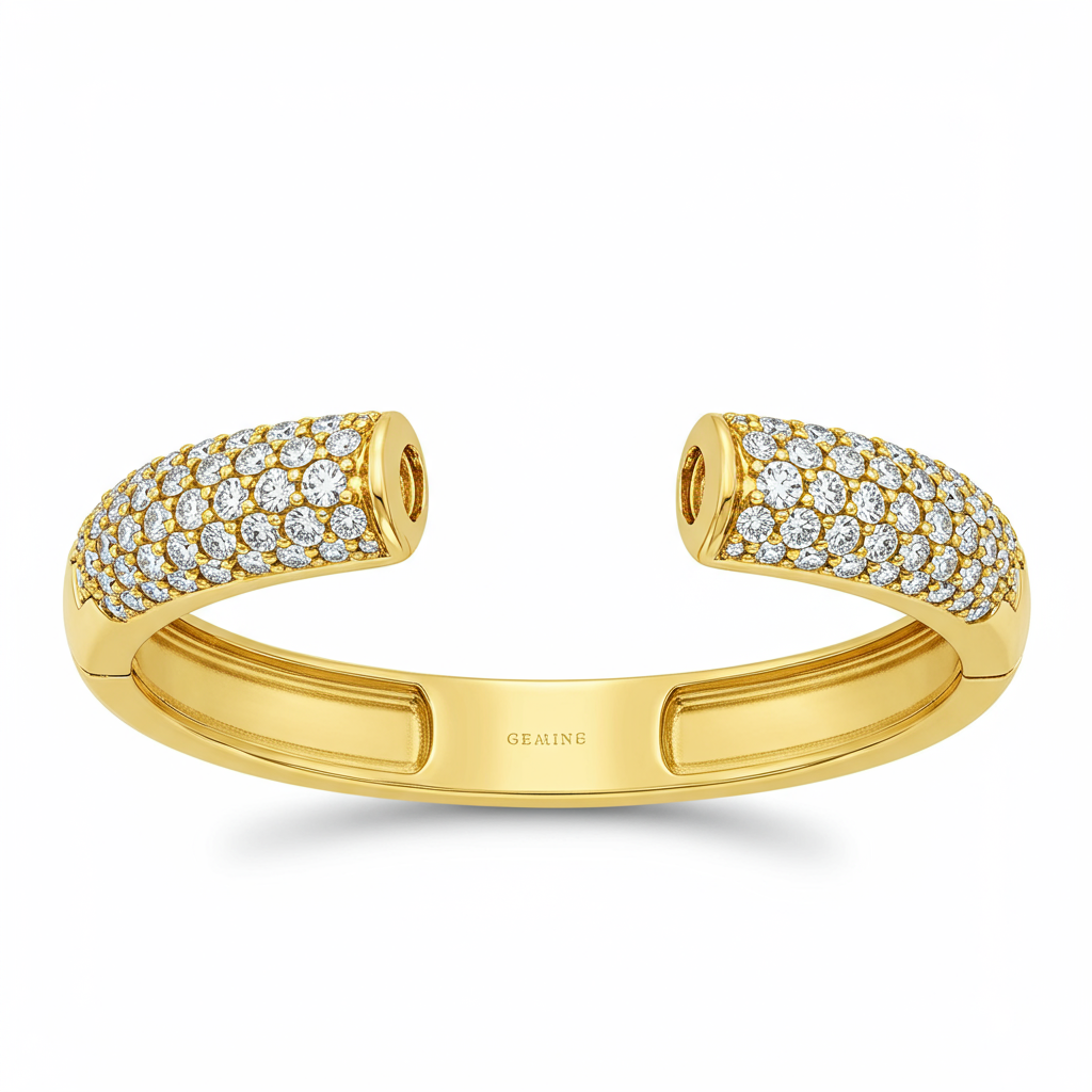 This contemporary cuff bracelet captures the playful elegance signature of designer fashion. Crafted in rich 18KT yellow gold, the smooth structure provides a comfortable yet stylish fit. The design is subtly accented with high-quality pavé diamonds, adding a luxurious sparkle perfect for both daytime chic and evening glamor. This piece embodies modern sophistication and makes an exceptional statement accessory.