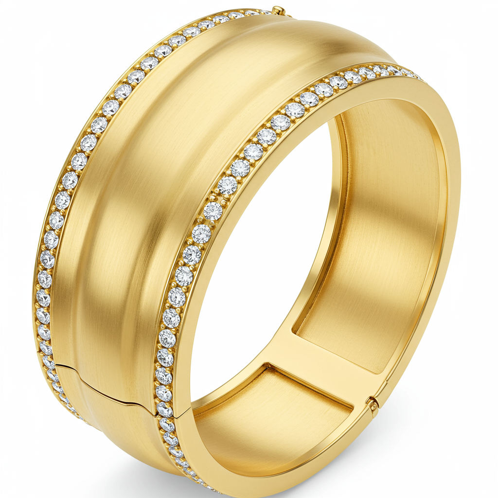 The Marc Jacobs inspired bracelet is a bold statement piece, combining modern minimalist form with luxurious diamond accents. Crafted in radiant 18KT yellow gold, its sleek cuff silhouette offers a comfortable yet commanding presence on the wrist. Subtle pave settings along the edges capture light beautifully, showcasing the exceptional brilliance of the VVS diamonds. This bracelet serves as a testament to contemporary sophistication, perfect for both everyday wear and elevated evening ensembles.