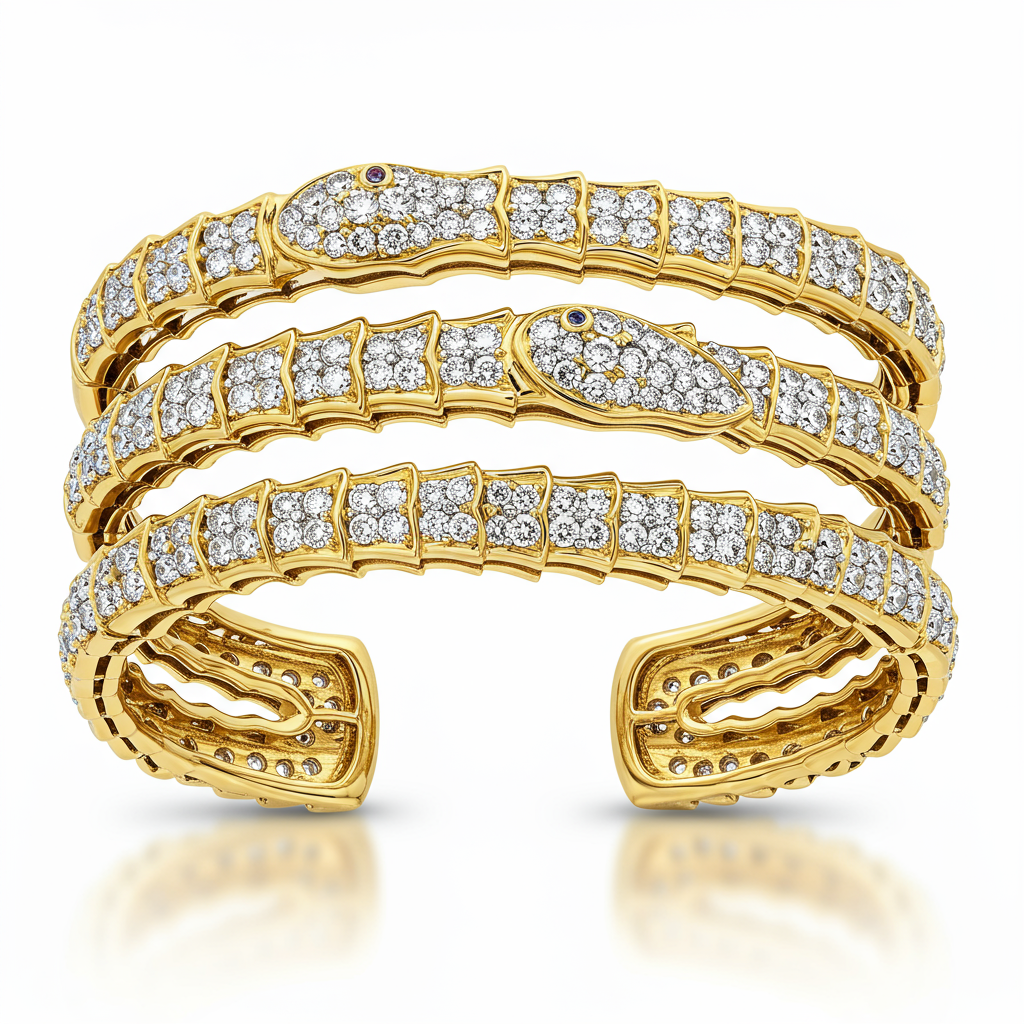 This magnificent serpent cuff bracelet captures the iconic Italian elegance synonymous with ancient Roman design. Crafted in radiant 18KT yellow gold, the piece wraps around the wrist in a fluid, sculptural form, showcasing masterful craftsmanship. Its surface is entirely paved with 2.50 carats of brilliant VVS round diamonds, meticulously set to maximize light return and sparkle. A true statement piece, this luxury cuff embodies sophistication and bold, architectural luxury, perfect for the most discerning collector.
