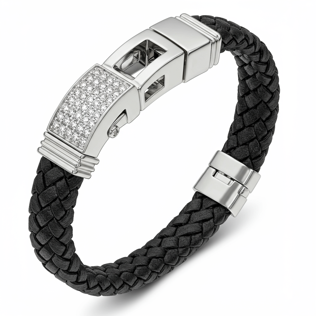 The Men's Leather Bracelet combines rugged sophistication with luxurious detailing, perfect for the modern man. Featuring a robust braided black leather band, it is accented by a sleek box clasp crafted in premium 18KT white gold. This secure clasp is meticulously paved with brilliant VVS round diamonds, adding a subtle yet undeniable flash of luxury and distinction. This piece serves as a timeless statement accessory, bridging everyday wearability with high-end jewelry design and superior craftsmanship.
