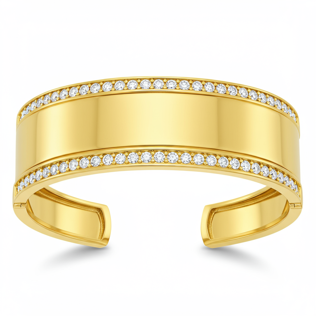 This exquisite engravable cuff bracelet merges personalized elegance with luxurious craftsmanship. Forged in radiant 18KT yellow gold, the design features a substantial, highly polished central plate perfect for custom inscription. The edges of the cuff are subtly adorned with a row of brilliant, VVS-clarity diamonds, adding a discreet touch of sparkle. This piece is a timeless treasure, ideal for celebrating milestones or creating a deeply meaningful gift.