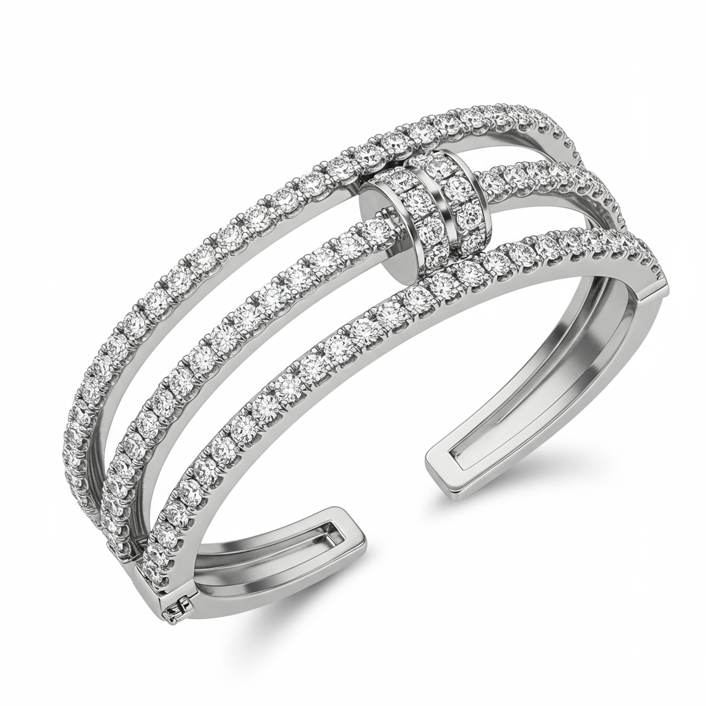 The Nail Bracelet reinterprets raw, industrial geometry into a piece of exquisite high jewelry. Crafted in luxurious 18KT white gold, this iconic cuff features a sleek, ergonomic structure that wraps the wrist with effortless modern style. The entire surface is meticulously paved with brilliant VVS round diamonds, creating a continuous, dazzling stream of light. This sophisticated design makes it a versatile statement piece, perfect for contemporary luxury collectors and everyday wear. It embodies rebellious elegance and precision craftsmanship.