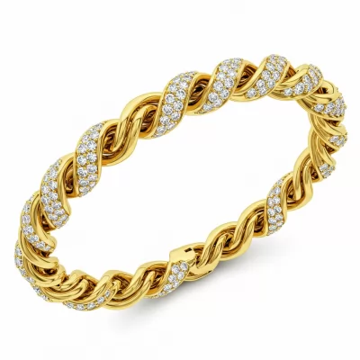 The Rope Chain Bracelet embodies classic elegance reimagined in fine jewelry form. Crafted in lustrous 18KT yellow gold, this substantial design features an intricate twisted rope pattern, offering exceptional texture and dimension. Interspersed links are meticulously set with brilliant VVS round diamonds, catching the light with every movement. It is secured with a robust yet elegant clasp, making it a perfect statement piece for luxurious daily wear and evening events.