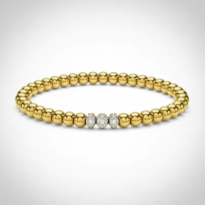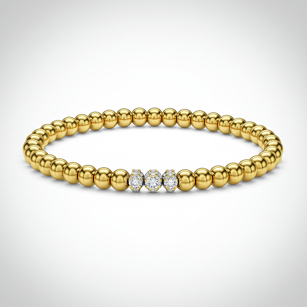 This exquisite stretch bracelet captures effortless elegance, featuring polished 18KT yellow gold beads interspersed with dazzling diamond-encrusted accents. Designed for comfort and versatility, it slips easily onto the wrist, providing a constant touch of luxury. Each accent bead is meticulously hand-set with high-quality VVS diamonds, ensuring maximum sparkle from every angle. It serves as the perfect layering piece or a stunning standalone statement.