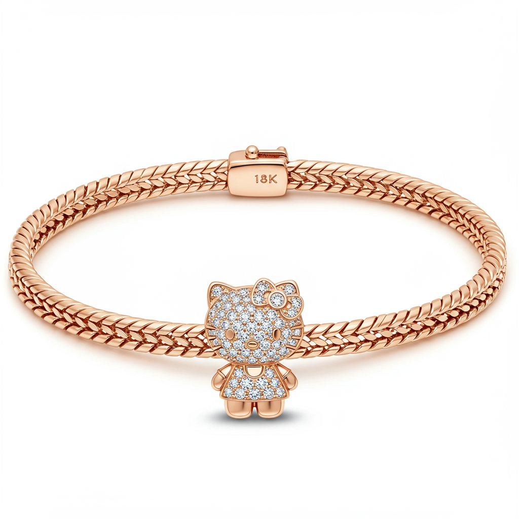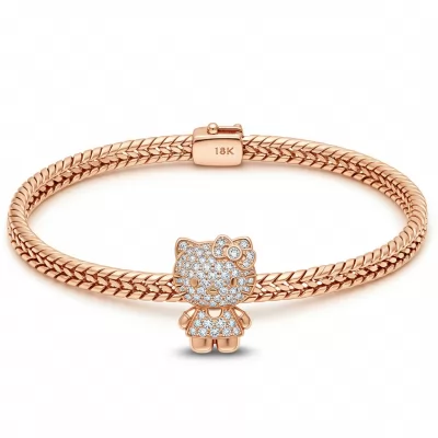Adorn your wrist with the whimsical elegance of the Hello Kitty Diamond Charm Bracelet. Crafted in polished 18KT Rose Gold, this bracelet features the iconic figure pavé-set with brilliant VVS diamonds, capturing playful sophistication. The delicate chain ensures a comfortable fit while the high-polish finish provides an irresistible sparkle. This designer piece is a perfect blend of high fashion and nostalgic charm, designed for modern luxury lovers.