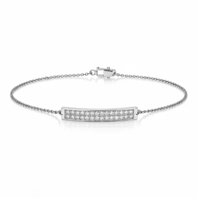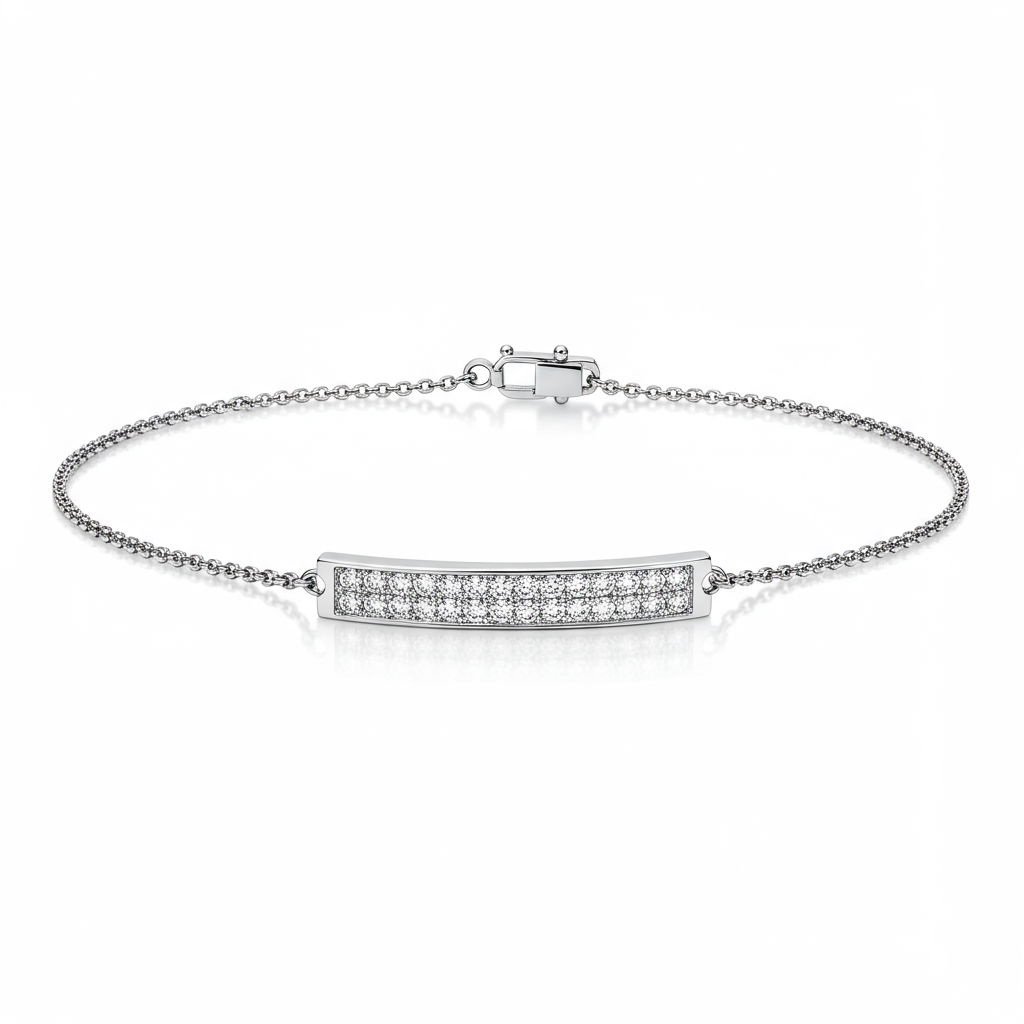 The Personalized Name Bar Bracelet offers a deeply personal statement combined with modern luxury. Crafted in radiant 18KT white gold, the sleek central plaque is meticulously pavé-set with brilliant VVS quality diamonds, ensuring unparalleled sparkle. This bespoke piece serves as a timeless emblem of identity, connection, or a cherished memory. Secured by a delicate yet strong adjustable chain, this bracelet transitions effortlessly from daily wear to sophisticated evening attire.